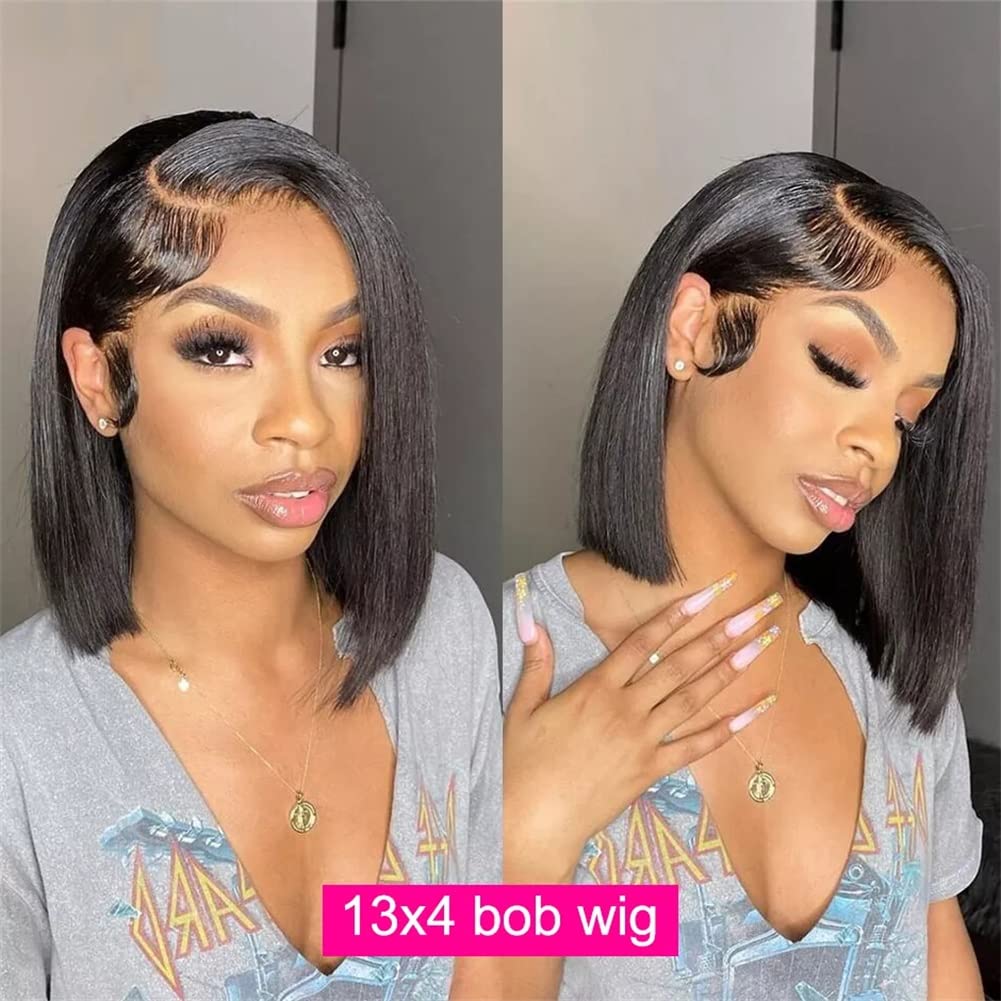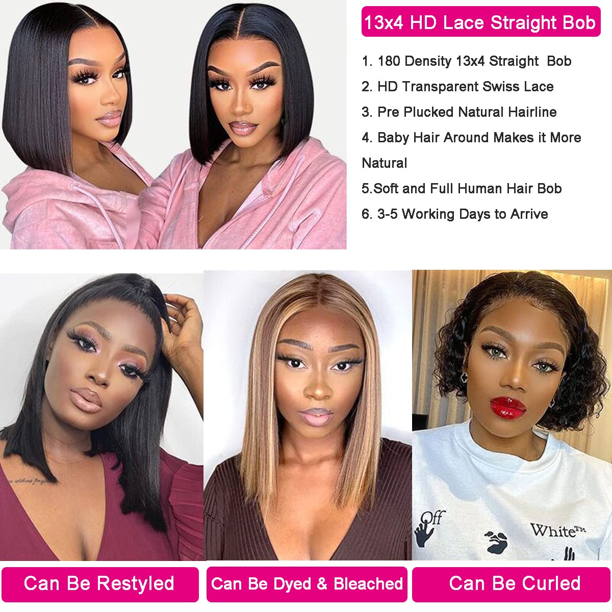 2.Hair Length & Density: 10-14 inch HD Lace Straight Human Hair Bob Wig in 180 Density. Natural Black Color, Can be dyed or bleached As Your Like.