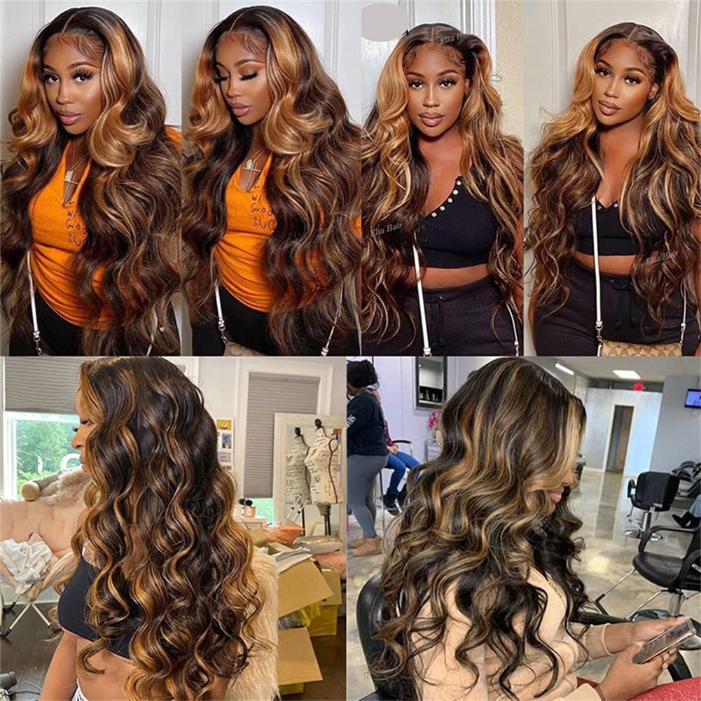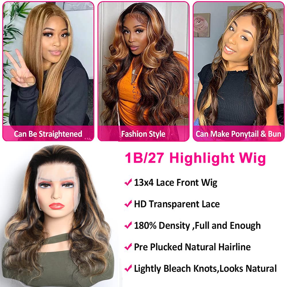 ★Highlight 1B/27 Lace Front Wig: Ombre Highlight Body Wave 13X4 Transparent Lace Front Wigs 180 Density 1B/27 Color Brazilian Unprocessed Virgin Hair. Bouncy & Soft. No Chemical Process.