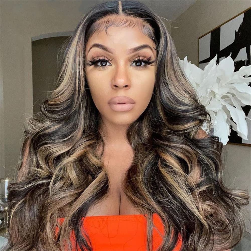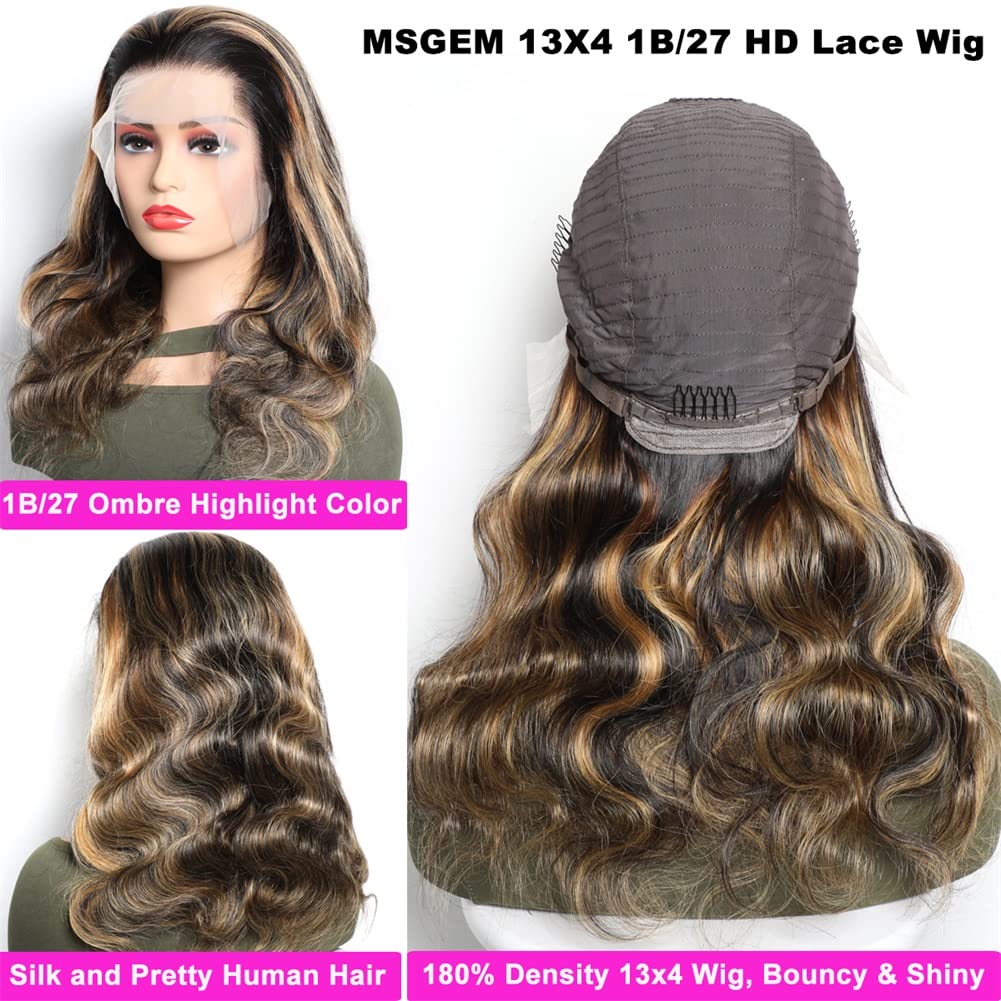 MSGEM 26 inch Highlight 1B/27 Body Wave Lace Front Wigs Human Hair Ombre Highlig