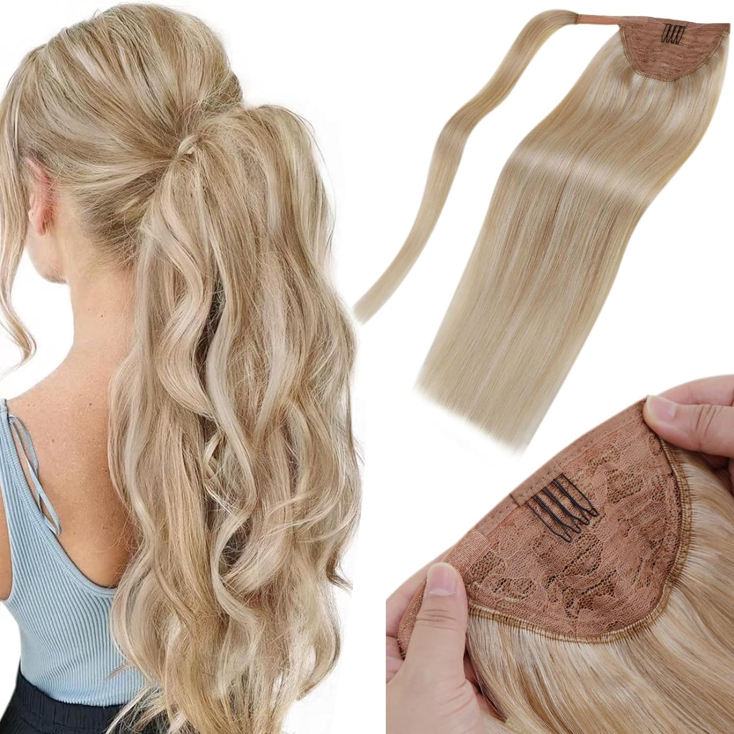 LaaVoo Blonde Hair Extensions Ponytail Real Human Hair 16inch Light Golden Brown