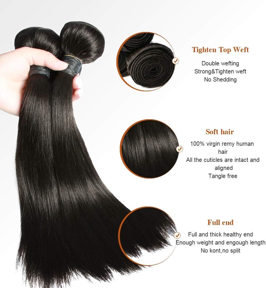 Hair Color:Brazilian natural hair, unprocessed natural black color in straight bundles, it can be curled, dyed and styled like your own hair, silky and durable.